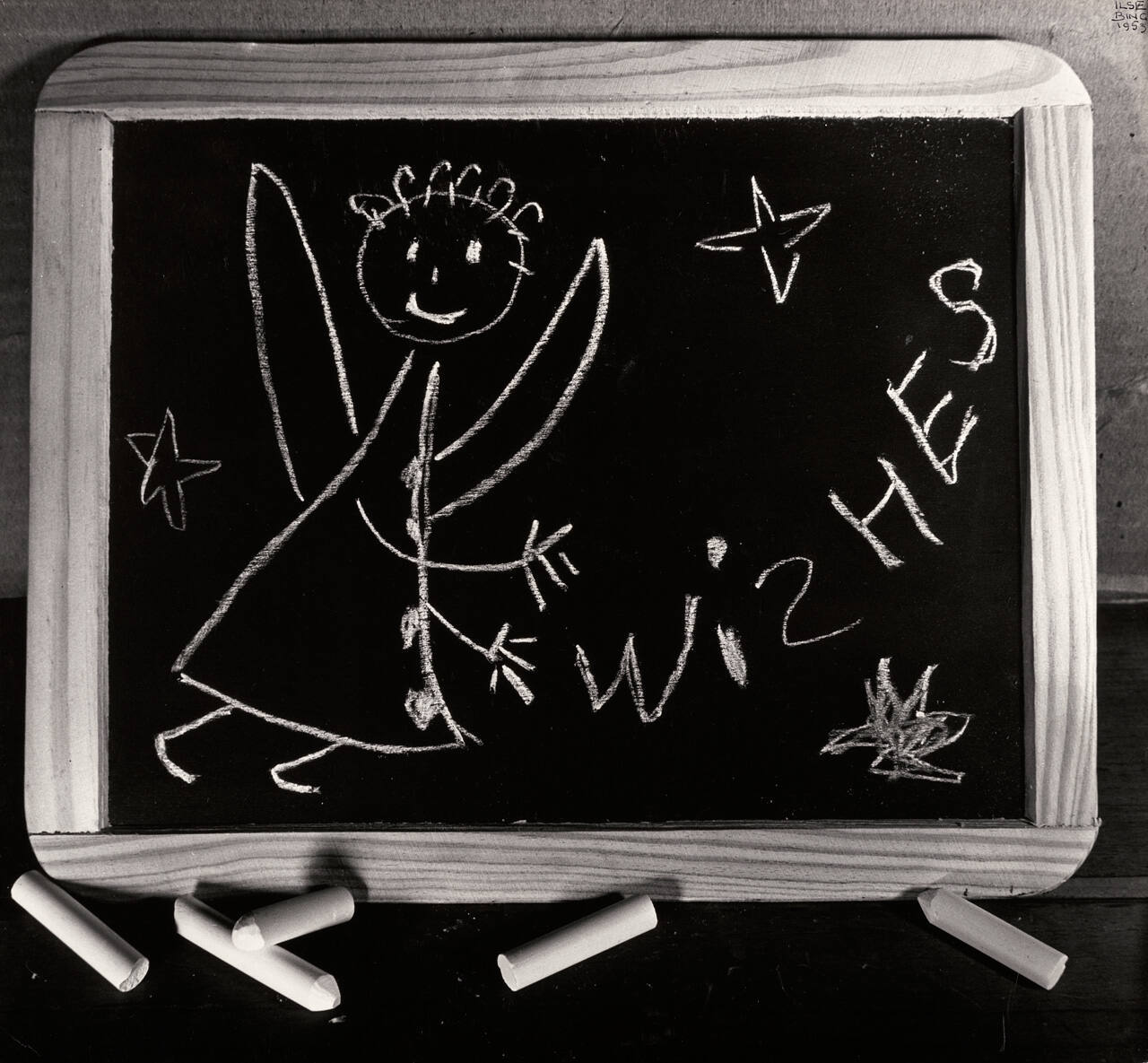 DescriptionImage of a chalkboard with a simple hand-drawn illustration of a smiling winged figure next to the word "WISHES".Copyright© Estate of Ilse Bing, courtesy Edwynn Houk Gallery, N.Y.