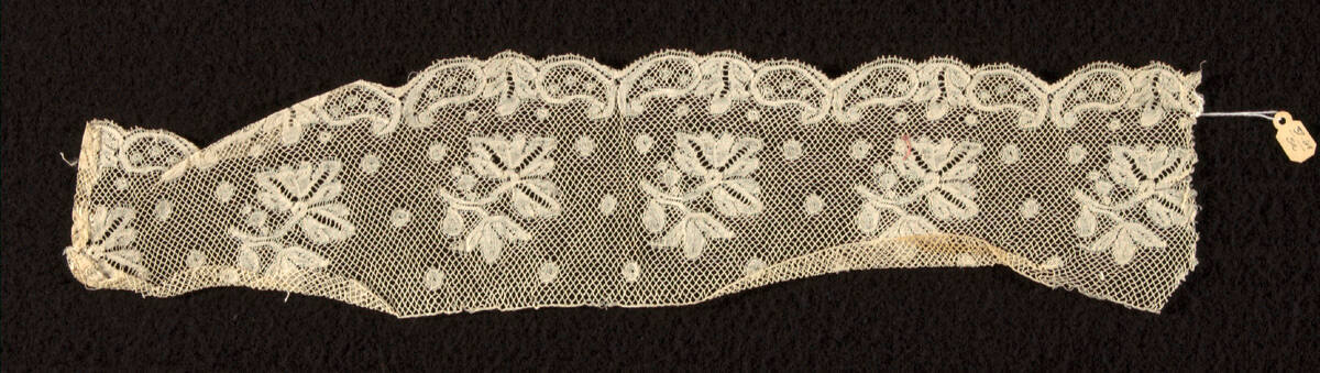 DescriptionBobbin-made straight lace of the Valenciennes type. Square plaited mesh ground; pattern worked in whole stitch.Provenance