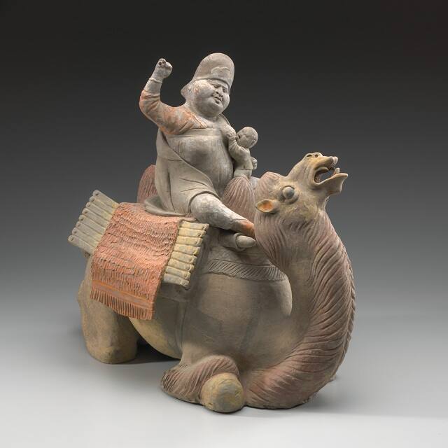 DescriptionA Western Asiatic woman, who is nursing a baby at her bare left breast, sits astride a kneeling Bactrian camel between its two humps. The plump-proportioned woman has distinctive Turkic facial features, modeled full cheeks, sunken small eyes, hooked nose, and pout lips. She wears the high cap, pants, and boots convenient for nomadic life. She raises her right hand as if pulling the camel's rein, and curves her left fist as if to grasp the reins, even while she holds the baby in her left arm. The suckling baby wears split pants that charmingly expose its naked bottom. The open-mouthed camel is modeled with fur on its head, under its arched neck, on its humps, and around its front legs. It wears a fringed saddle blanket with criss-cross patterns, cut to let the humps through. The heavy load on the sides of its humps consists of a fringed blanket covering hinged slates of wood, under which bulky rolled-up blankets or tent equipment are suspended by two poles fastened by ropes. The load is tightened by painted and incised girdles crossing the neck and body of the camel. The group of figures is painted in ochre, red, black, and orange.Gallery LabelHomely details captured as an instant in motion give this burial sculpture vividness and charm. Particulars of costume and face indicate that she is Turkic, not Chinese. In the caravan world, her role was to care for the family.The intensity of concern of her facial expression is matched by the truculent dismay of the came, registered in the reared head, startled wide eyes, screaming mouth, and straining neck. A cord once ran from her upraised right hand to the camel's nose. Projecting front and back from under the saddle blanket are the hinged ends of a yurt frame over which would have been draped panels of felt, seen here rolled up between the yurt frame and the camel's side. Clay models such as this were only intended for burial to accompany the deceased in the afterworld.