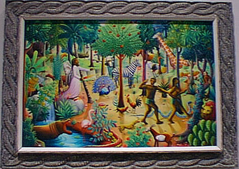 Gallery LabelAndré Normil is best known for his detailed and vividly colored panoramic scenes of paradise, Noah's ark, carnival and everyday Haitian life. Normil is ambiguous about his relationship with Voodoo, the African-based religion of Haiti. He says he "still believes in it a little." In fact, Voodoo, is a way of life in Haiti. Its deep regard for the spiritual vitality of nature and events can be felt in the work of many Haitian artists, Normil included.