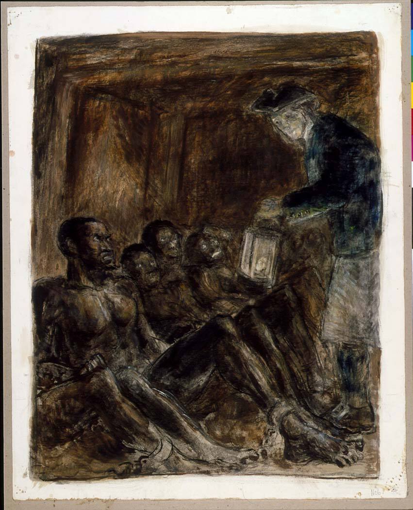 The Slaver relates to the prelude to Benet's poem, which evokes the slave trade in Colonial America. Curry illustrated a passage that describes a fearful shipmate's descent into the dark, damp hold, where he encounters a striking and defiant captive. He emphasized this tense confrontation by placing the two men in opposite corners of the composition.