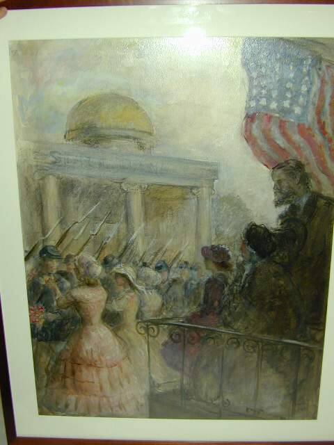 DescriptionIn a vertical format, this illustration depicts a procession of soldiers marching in front of a building identified as a bank. Some of the soldiers are greeted by ladies who place flowers on their jackets. The procession is watched from a balcony on the right side of the composition by a smaller group comprised of a girl, woman, and man. The American flag hangs prominently over their heads.Copyright© John Steuart Curry Estate / Kiechel Fine Art