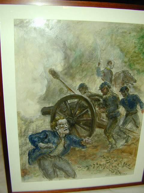 DescriptionIn a vertical format, this illustration depicts an advance of troops during war. Three soldiers accompany a cannon in th emiddle of the composition. In the background, a soldier raises his sword, thereby commanding the troop's movement. In the foreground at left, a crazed, perhaps wounded, soldier flees the implied conflict.Copyright© John Steuart Curry Estate / Kiechel Fine Art
