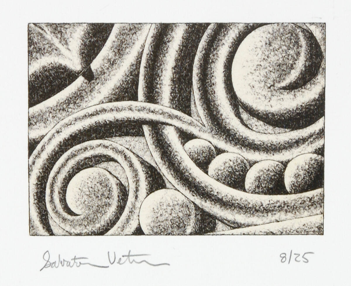 DescriptionLarge volute, right, atop 4 1/2 balls is connected by swirl to half volute, bottom left corner. Upper left, partial curve intersected by two pointed segments.Copyright© Salvatore Ventura