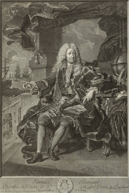 DescriptionBewigged man seated center wearing velvet coat and knee breeches; long, brocaded waistcoat, stock; left forearm supported on table, right, which bears globe, right arm extended forward along chair arm, index finger pointing left, where beyond sair rail, three large sailing ships and severals small boats; two columns behind him partly obscured by billowing, tasseled drape extending across top. Bottom center is Bernard crest and inscription.