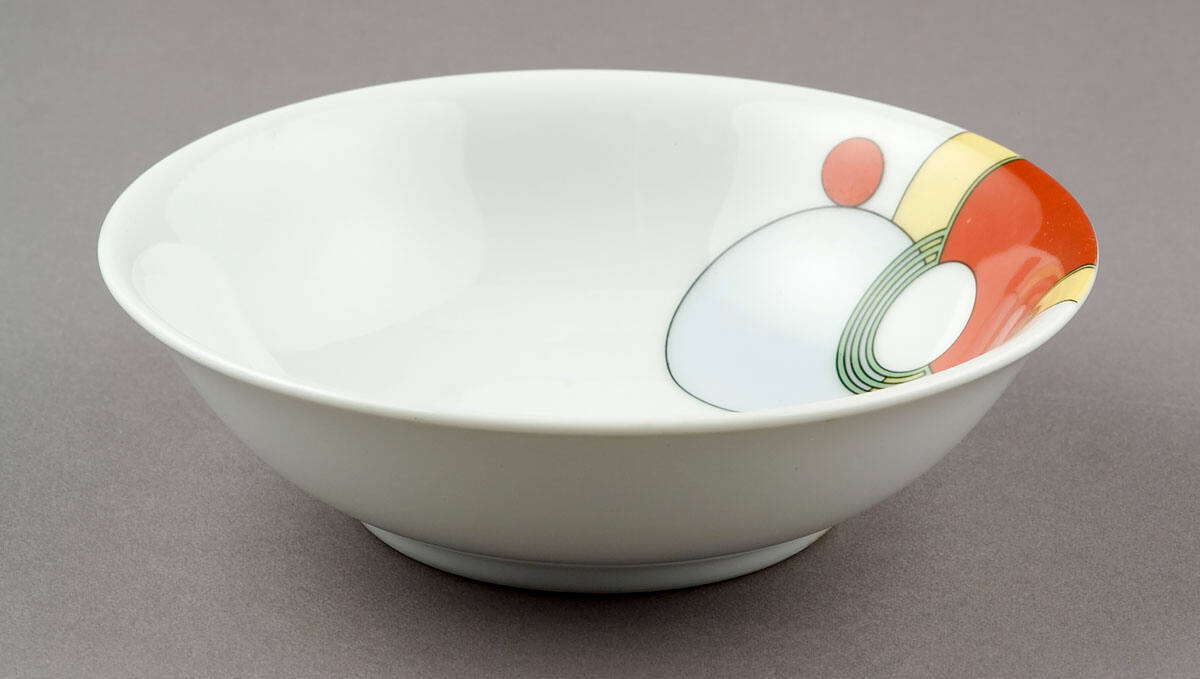 DescriptionWhite porcelain with patterns inside of overlapping and intersecting cirlces delineated by thin black lines and colored in light grey, red, yellow, green and gold.Copyright© Frank Lloyd Wright Foundation, Scottsdale, AZ / Artists Rights Society (ARS), New York