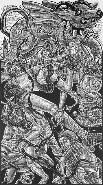 DescriptionCentral shorts-clad, rollerskating, helmeted girl bearing tray of food in raised right hand, head facing front, stands above and to the left of masked figure atop dolphin, holding paddle with ball on string, and at the right, a kneeling boy with gripped hose merging from hind-quarters, extending left and upward to floating pig-like balloon marked "Foxy Taco!" Right margin, center, a masked hatted figure sits on turtle-like being on spring atop platter of spiky vegetal material. Near top left, a running shorts-clad woman in front of a line of buildings extending to the right.Gallery LabelTom Huck is best known for his large-scale satirical woodcuts of the small and strange rural Missouri town in which he grew up. In Gag Bags and Taco Girls we see a risqué waitress on roller skates delivering lunch while pulling her son in a wagon. His flatulence inflates a balloon in the shape of a mythical animal overhead. The modulated gradations throughout this work are achieved through the artist's skillful woodcutting.