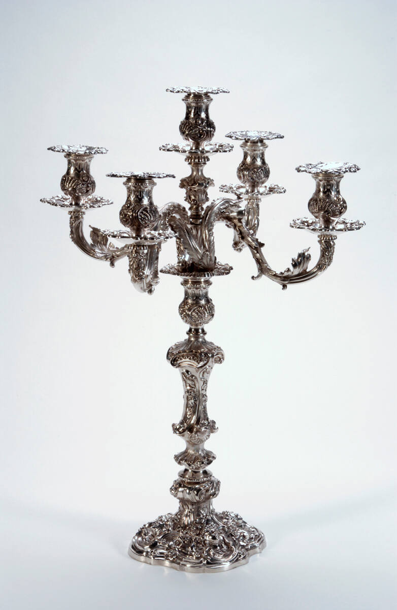DescriptionA - base; B - arm; C-G - bobechesBase of stepped foot and long ornamented shaft, decorated with sprial and C curves, small grapes and leaves, flowers, shells; four upturned faces on foot. Candelabra of 4 S-shaped arms covered wtih icanthus leaves and attached to a central shaft. At the end of each of the four amrs and the vertical shaft is a small saucer and vessel which is open at the top to receive the saucer shaped candle holders.