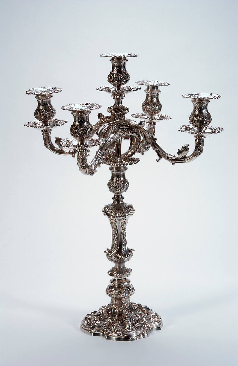 DescriptionA - base; B - arm; C-G - bobechesBase of stepped foot and long ornamented shaft, decorated with sprial and C curves, small grapes and leaves, flowers, shells; four upturned faces on foot. Candelabra of 4 S-shaped arms covered wtih icanthus leaves and attached to a central shaft. At the end of each of the four amrs and the vertical shaft is a small saucer and vessel which is open at the top to receive the saucer shaped candle holders.
