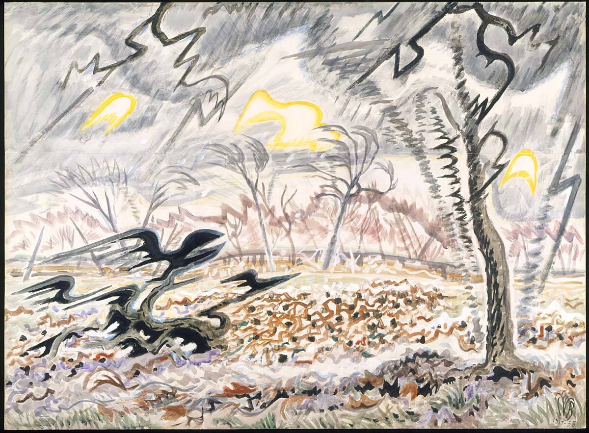 DescriptionThis large, nearly abstract composition features a variety of landscape elements (trees, foliage, sky, and grass), all painted with energetic lines. The composition is predominantly brown and gray, accentuated will limited passages of brighter color, including yellow and purple.Gallery LabelCharles Burchfield is best known for his large-scale watercolors of moody, foreboding places. In Stormy Day in March, he depicted a landscape beset by threatening weather. Typically, all forms of nature--clouds, lightening, and vegetation--appear interconnected through the artist's agitated mark making. Involving multiple sheets of paper fixed together over many years, Burchfield's working method mirrored nature itself, which is similarly in a state of continuous evolution.