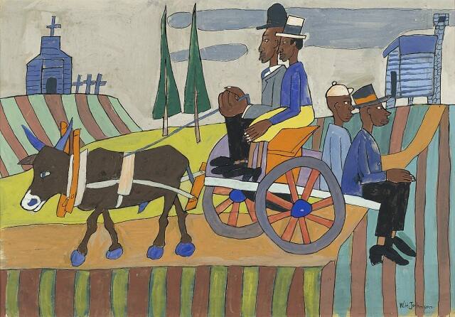 DescriptionThis colorful watercolor shows a group of four people going to church in a wagan pulled by a bull. A man and a woman (husband and wife?) sit in the front, while two younger males (their sons?) sit in the back. Their destination appears on the horizon line toward the left side of the composition. A sketch of a woman appears on the verso.Gallery LabelWilliam H. Johnson’s best-known paintings are characterized by the flattened perspective and bright colors seen in Going to Church. The artist’s interests in modern art and folk art shaped this deliberately naïve-looking style. His work shifted toward this appearance after he spent almost ten years in France and Scandinavia working in modernist styles popular in Europe.
