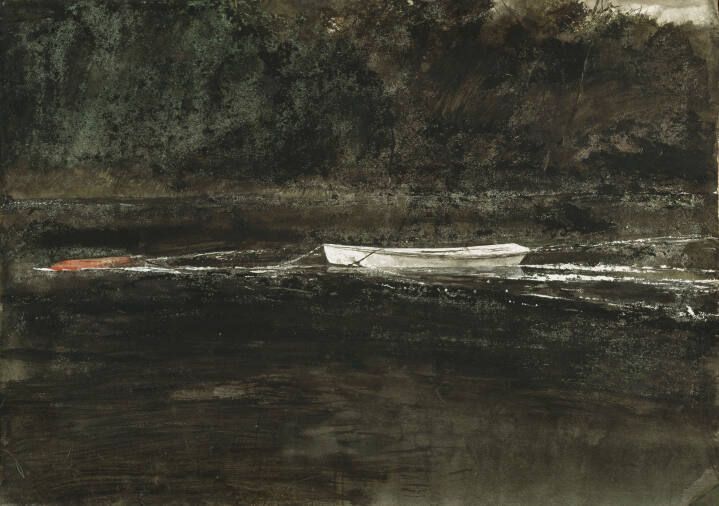 DescriptionHorizonally oriented, this dark, moody image features a lake with dense foliage behind. Two forms in the water--one red, the other white--suggest abandoned boats.Gallery LabelAndrew Wyeth paints frequently in Maine, where he likely captured the image of this lone boat abandoned in a lake. Applying washes of dark brown pigment, the artist effectively utilizes the texture of the paper to suggest the densely forested setting and murky water. The title informs the viewer that the boat is anchored, an allusion to unseen human activity, which contributes a layer of mystery to the otherwise unexceptional subject matter.