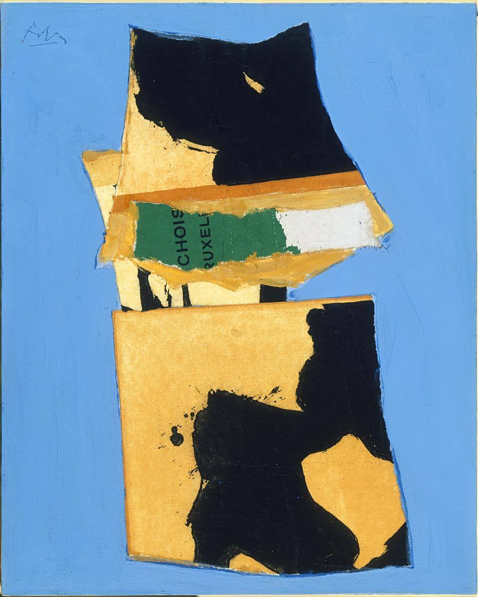 DescriptionThe composition of the collage is roughly that of a vertical rectangle, made of torn paper, with poured and dripped paint upon a monochromatic ground. The paper that makes up the rectangle is colored black, ochre, and has a small area of bright green in the upper center. The ground is vivid blue.Copyright© Dedalus Foundation, Inc. / Licensed by VAGA at Artists Rights Society (ARS), New York