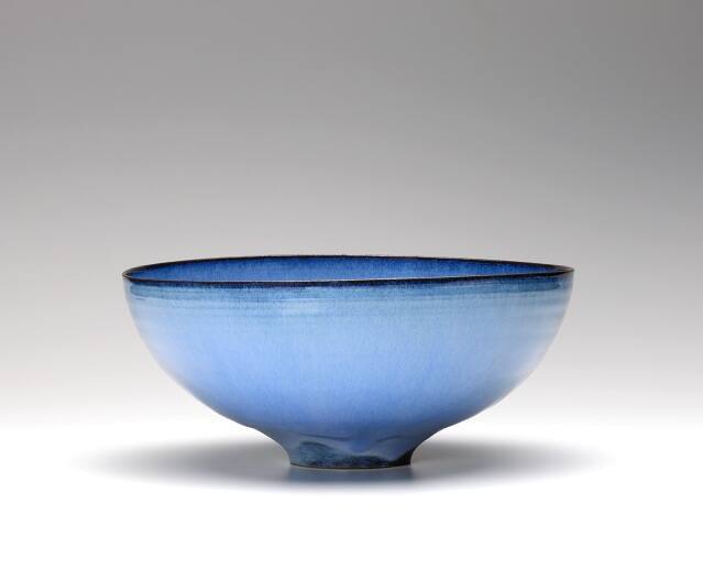DescriptionA blue bowl. On the inside, at the center, the glaze thins to reveal a more pale blue with a dark blue spiral. The rim is a deep blue.Gallery LabelFleeing their native Vienna as the Nazi forces advanced toward Austria in 1938, the husband and wife ceramicist team of Otto and Gertrud Natzler arrived in America with their potter's wheel, their kiln and little else. The Natzlers' ability to persevere and succeed with little training and few assets fueled what would become a nearly 40-year collaboration that combined Gertrud's elegant and classically formed ceramic vessels with Otto's multifaceted glaze formulations and firing techniques. With less than a year of training, Otto describes the couple's beginning years in their Vienna studio: "Our lack of knowledge went hand in hand with a lack of inhibitions." Their continual experimentation with materials and methods led to these wafer-thin vessels that glow from vibrantly hued glazes with both the smoothness of glass and the roughness of volcanic lava.