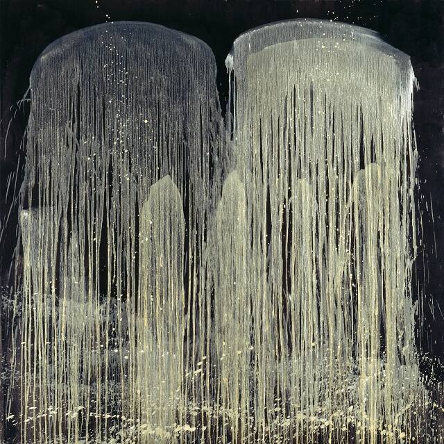 DescriptionThis painting has a black background over which, thin, cream colored paint has been allowed to vertically run. Two large areas of cream paint are at the upper register of canvas, and four similiar, but smaller shapes occur below these. The work is composed primarily of dripping rivulets of paintGallery LabelPouring, dripping, and flinging paint, Pat Steir creates, at once, an illusionistic image of a waterfall and a physical record of liquid obeying the laws of gravity and force. In the process, she honors two esteemed traditions: Chinese landscape painting and American Abstract Expressionism.