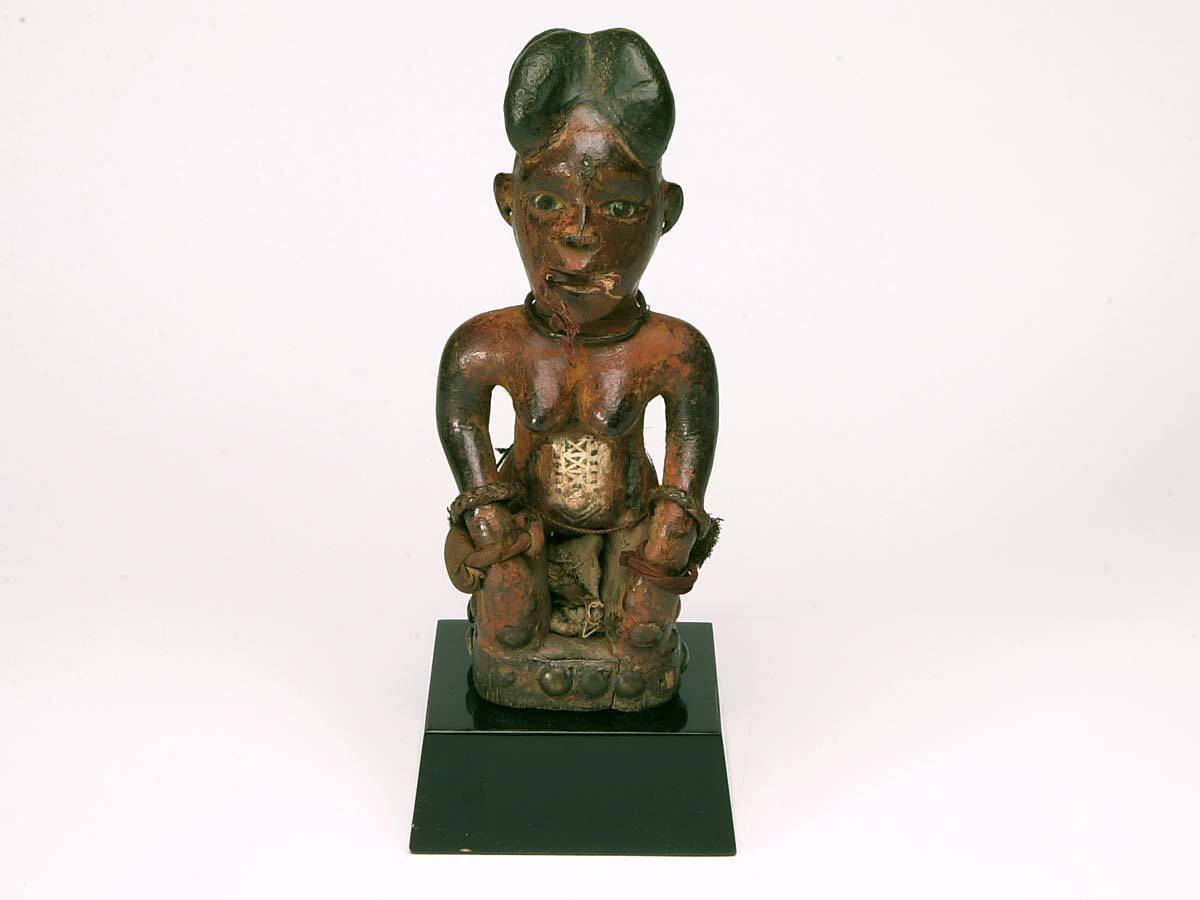 DescriptionThe kneeling figure of a woman with the hands resting on the knees. The head and body are red with tukula. Four-lobed blackened coiffure above a realistic face with glass eyes. A piece of cloth is stuck in the mouth, another one between the legs. Iron ring around the neck. Wide shoulders, round breasts, a geometrical pattern on the abdomen whitened with kaolin. Several carved bangles on each wrist, plus loose bracelets of braided fiber and of cloth containing magico-symbolic substances. Brass tacks in the legs and around the square base.ProvenanceLeo M. W. van Oosterom (1937-1987), The Hague and Amsterdam, Netherlands, by 1984 [1];