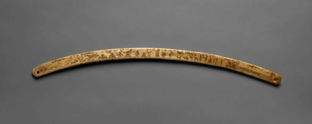 DescriptionSlender, curved ivory form of rectangular cross-section, covered with engraved, pigment-filled images of Eskimo life: villages, hunting scenes, ceremonies, spirit figures.Gallery LabelSmall-scale, engraved ivory objects have served for millennia as the principal means of pictorial expression among Iñupiat peoples. The bow drill was an essential tool in traditional culture, and this particular work is notable for both the quality of its drawing and the unusually wide range of subject matter. Indeed, the world of the Iñupiat is fully revealed in the minute, complex imagery and compositional progressions that cover its four-sided surface. Depictions of masks, spirit forms, shamanistic transformation and ceremonial dances are joined with those of migrating birds, hunting, fishing, village life and domestic scenes.