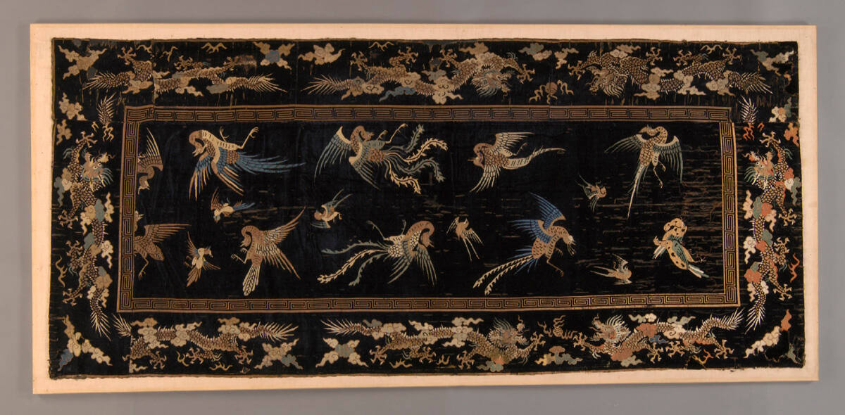 DescriptionDark blue velvet panel with phoenixes and other birds. Border with dragons and cloud motif in polychrome brocade. Paneled.