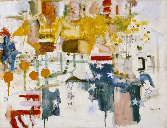 DescriptionUnfinished, thinly painted composition with flag over table, center foreground; yellow-orange tripartite seated half-length frontal figure upper center; cup and saucer on table, left; blue suit of armor, far left; yellow-flowered plant in drumlike pot, right.Gallery LabelLarry Rivers is considered a transitional figure between Abstract Expressionism and Pop art because he fuses expressive, gestural brushstrokes with images from popular culture.