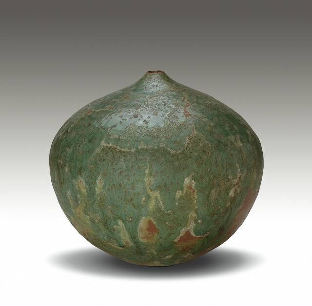 DescriptionOrange clay bottle over which there is a thin, shiny, smooth green glaze which has a slight ripple effect and white highlights.Gallery LabelFleeing their native Vienna as the Nazi forces advanced toward Austria in 1938, the husband and wife ceramicist team of Otto and Gertrud Natzler arrived in America with their potter's wheel, their kiln and little else. The Natzlers' ability to persevere and succeed with little training and few assets fueled what would become a nearly 40-year collaboration that combined Gertrud's elegant and classically formed ceramic vessels with Otto's multifaceted glaze formulations and firing techniques. With less than a year of training, Otto describes the couple's beginning years in their Vienna studio: "Our lack of knowledge went hand in hand with a lack of inhibitions." Their continual experimentation with materials and methods led to these wafer-thin vessels that glow from vibrantly hued glazes with both the smoothness of glass and the roughness of volcanic lava.