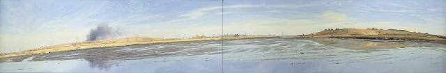 DescriptionThe painting depicts a panoramic view of a barren landscape. Along the left horizon a cloud of smoke rises. The scene is primarily blue water and sky, with a thin sliver of land in between.Gallery LabelRackstraw Downes' paintings of dumps, metal scrap yards, and oil wells, represent what industrial society has done to the landscape. This panoramic view depicts refuse visible at lowtide, dump trucks delivering their loads, and smoke rising from a fire. Downes tells the story of nature's violation with unflinching realism.