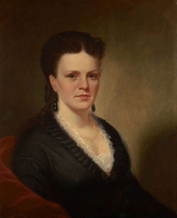 DescriptionHalf-length, three-quarter right profile portrait of dark-haired woman looking directly at the viewer. Subject is wearing hair up, with middle part and curls, wearing faceted jet drop-earrings, a pearl necklace and black V-necked dress with white lace around the neckline. Lower left corner with indication of upholstered chair, the whole on graduated and mottled brown ground.Published ReferencesNone.