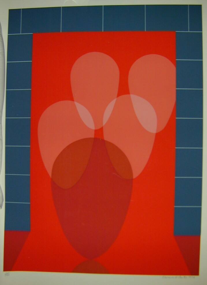 DescriptionWithin square arch of blue blocks, 7 on each side, 4 +2 1/4 across top, ending in dark red trapezoid at each bottom corner, on bright red ground, four light red vertical ovals with three pinkish overlaps and one dark red oval, bottom, with two brown-red overlaps, balanced on dark red semicircle. Upper ovals are in two horizontal rows of two, offset to right.Copyright© Estate of Clarence Holbrook Carter