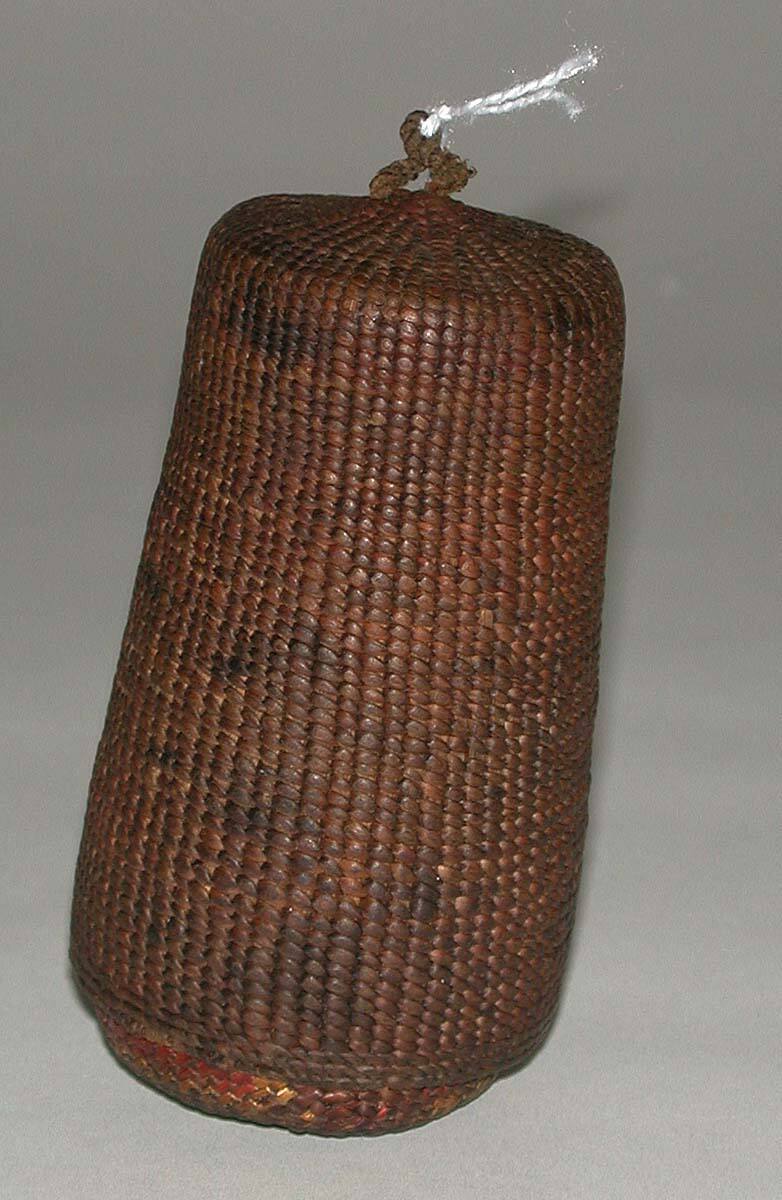 DescriptionInside of basket designs in brown, yellow, and orange stripes. plain, dull brown.