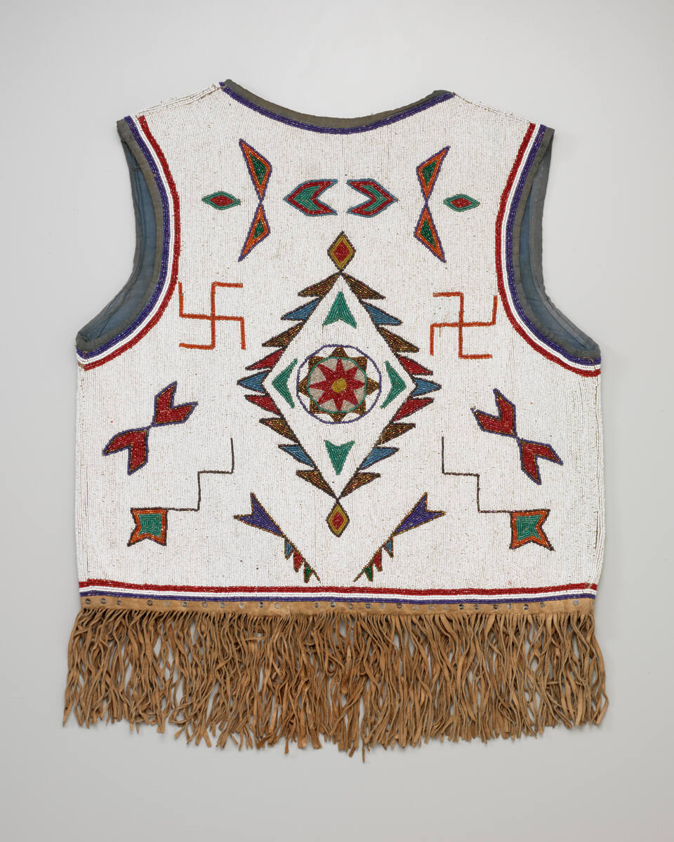DescriptionAdult sized vest solidly embroidered on the outer surface with multicolored geometric designs on a white background; cloth lined with native leather fringe along the bottom.