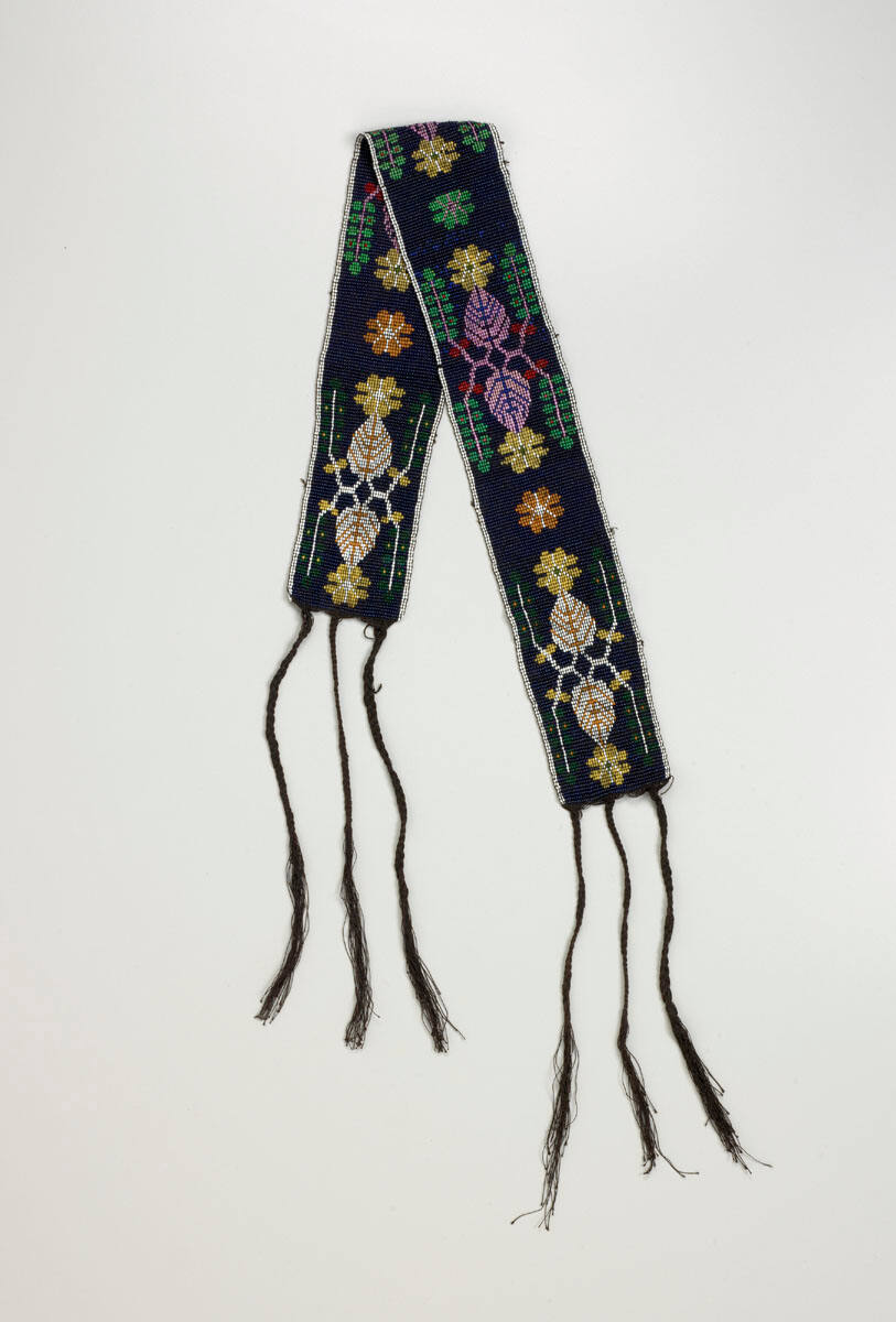 DescriptionBeaded belt on thread foundation with dark blue background and multicolored floral design; black thread ties at the ends.