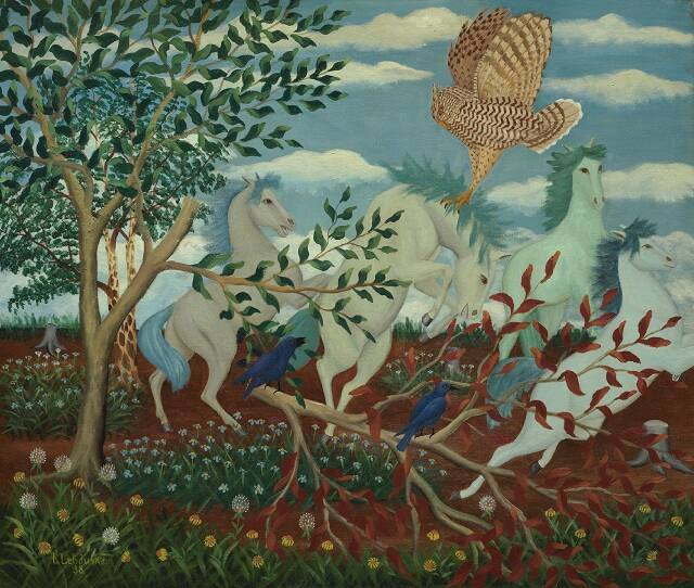 DescriptionThis horizontally oriented painting shows a lively group of animals--four horses, two blue birds, and an owl--in a landscape setting. A large tree occupies the extreme left of the composition while one of the horses gallops off the edge to the right. The ground is covered with patches of bright flowers. The color is bright and somewhat non-naturalistic (the leaves on a fallen branch are red). Overall, pale blue dominates, comprising the expansive sky filled with soft white clouds and the fanciful horses, which appear under attack by the large owl.Published References