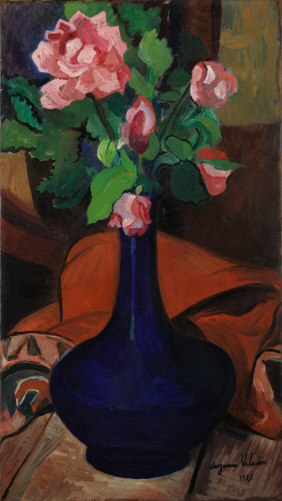 DescriptionThe painting is a still life with pinkish colored flowers in a dark blue vase centered in the vertically oriented composition. A piece of red cloth is depicted directly behind the blue vase.Gallery LabelPink rosebuds and one full blossom rise from a deep blue vase in this vibrant still-life painting. Suzanne Valadon was the first woman painter to be admitted to the prestigious Société Nationale des Beaux-Arts. A child of poverty, she began working at the age of 11, selling vegetables at markets and, later, as a circus acrobat and artist model. Among her friends were fellow artists Edgar Degas, André Derain, and Pablo Picasso. She was the mother of artist Maurice Utrillo, whose painting is also in the Nelson-Atkins' collection.
