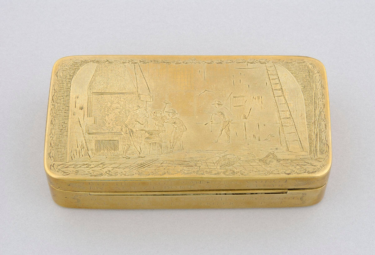 DescriptionNarrow brass box with hinged lid. The lid is engraved with four metalworkers in a foundry. The bottom is decorated with engravings showing the interior of a shop with a female clerk, a male helper and a male customer. Text is engraved around the sides of the box. On the front of the box is engraved the date: "July 30, 1754".