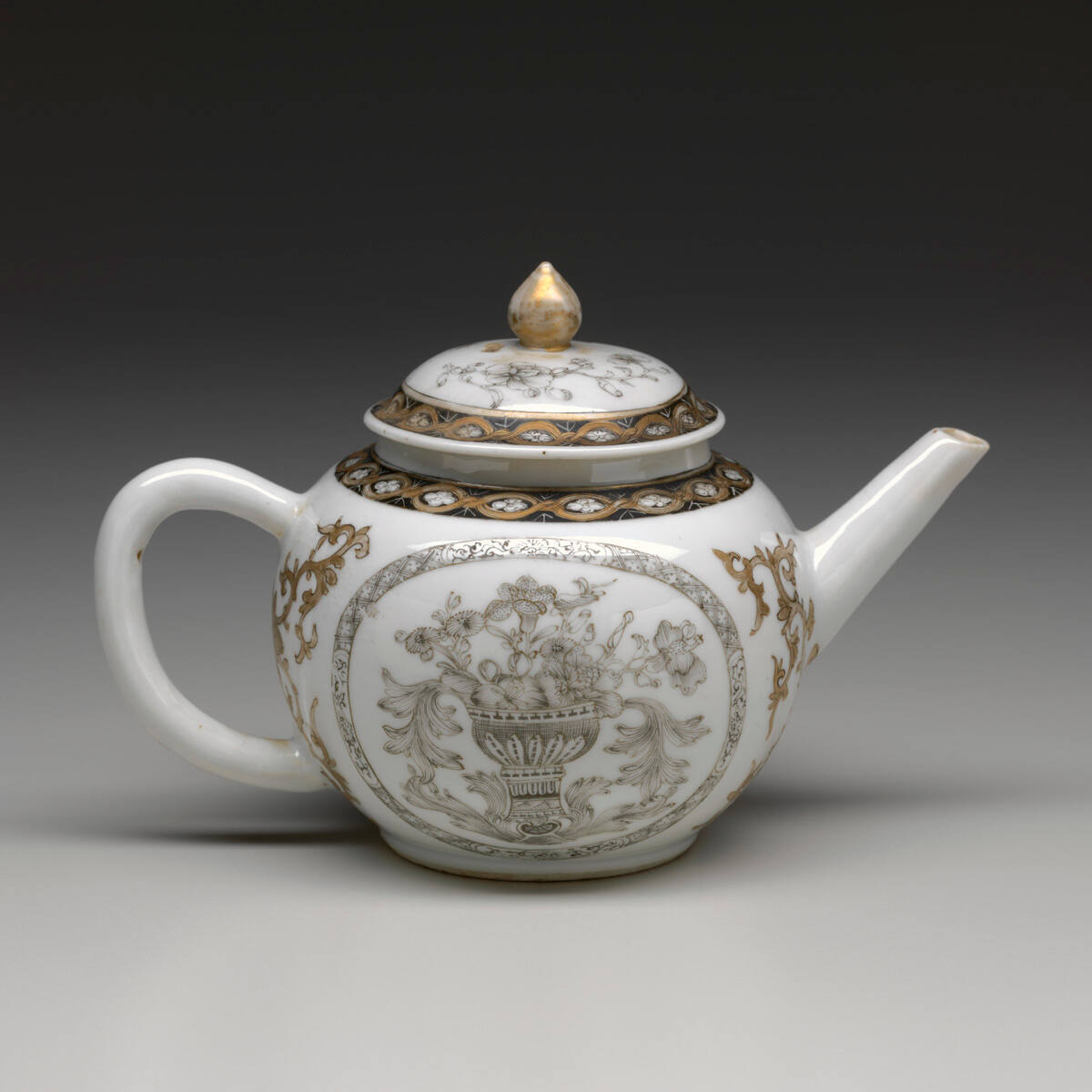 DescriptionChinese export porcelain teapot with lid with grisaille decoration of bouquets of flowers in large vases. The rim of the teapot is decorated with black enamel and gilded guilloche with quatrefoils. The lid has similar motif around the rim and a gilded finial.
