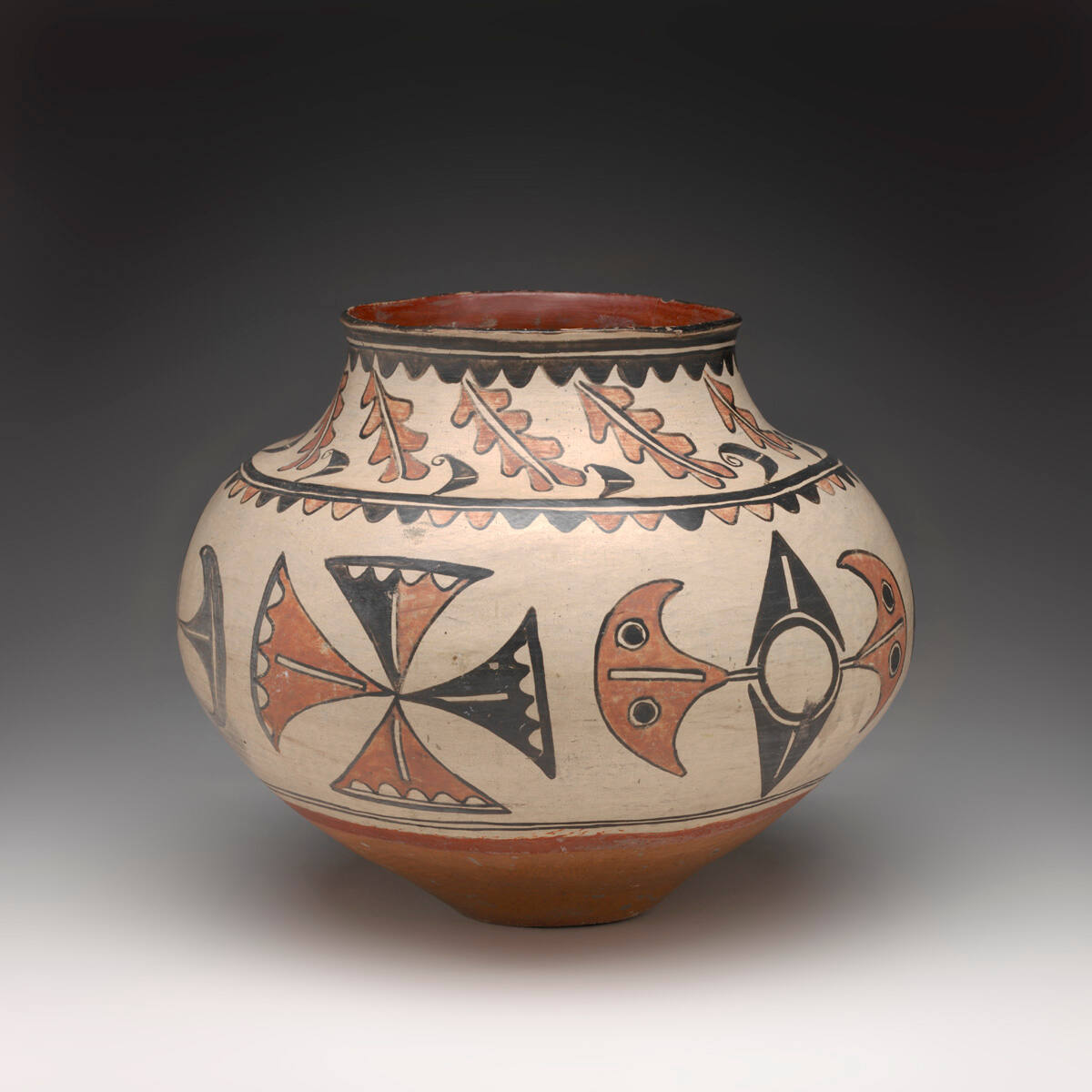 DescriptionLarge globular ceramic jar with scalloped and foliate designs painted on a short neck, with floating abstract motifs encircling the body.