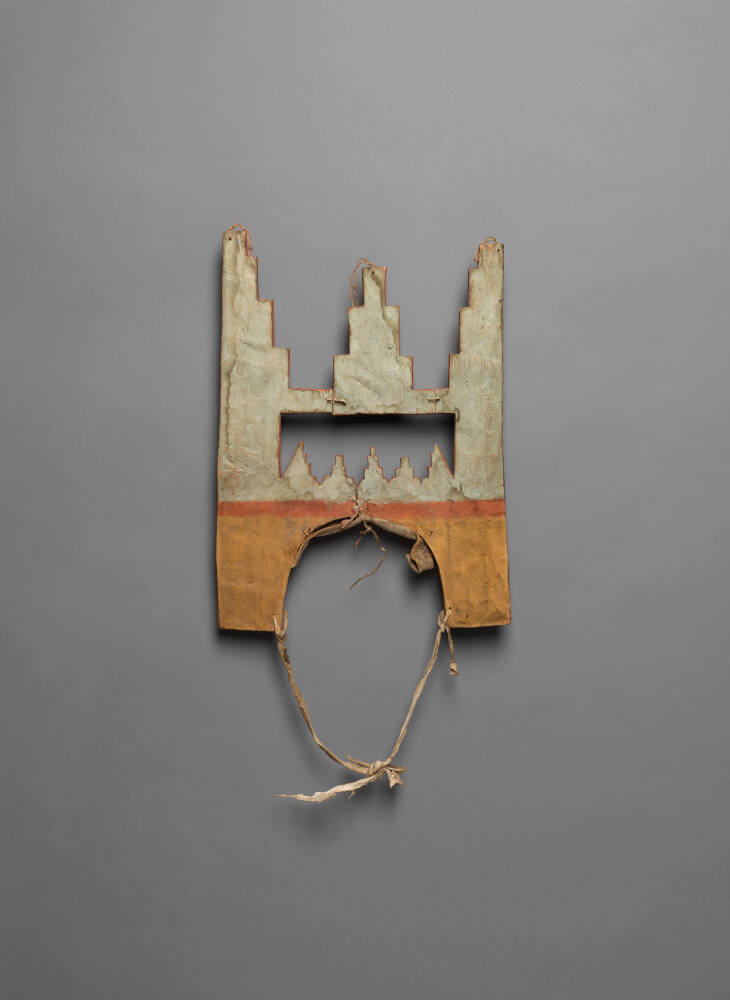 DescriptionHeaddress made of wood and painted with native pigments.Gallery LabelHeaddresses of this type, known as tablitas, are worn by Pueblo women in many ceremonial dances. This is one of a set of approximately 16 that purportedly came to Taos from Acoma Pueblo, perhaps by exchange, during the third quarter of the 19th century. The 16 were carved in different configurations, but each represented towering, stepped clouds over the landscape. All were carved of hand-adzed wood and painted with native pigments, with blue-green sky above and yellow ochre earth below, separated by a red ochre band that may represent the dawn or dusk.