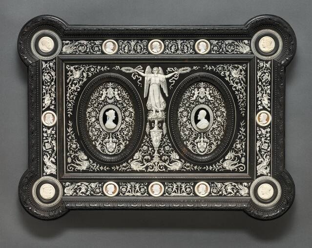 Giovanni Battista Gatti specialized in decorative objects made of ebony with elaborate inlaid ivory ornament. The intricate technique and the motifs of grotesques, foliage, and animals drew from Italian and German Renaissance sources. In this panel, Gatti included ivory portraits of the Italian Renaissance artists Leonardo, Michelangelo, Raphael, and Perugino. He also incorporated portraits of ancient philosophers and emperors. Gatti (Italian for “cats”) often included his namesake in his works. Can you find a feline face near the center of the panel?
