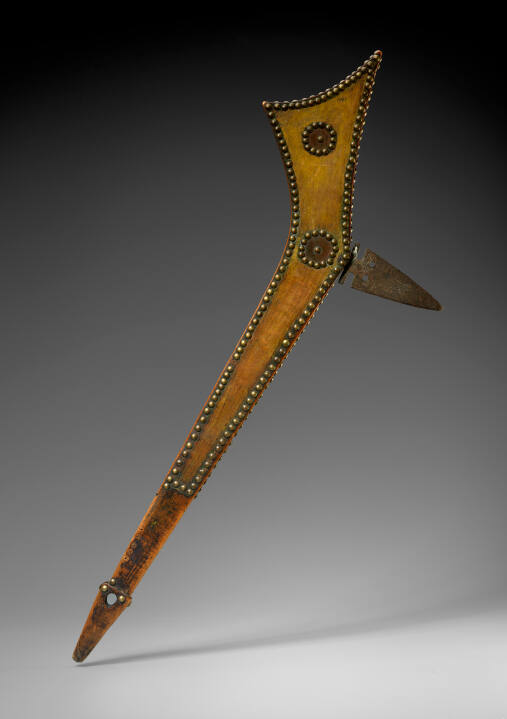 DescriptionAngular board-like club in the shape of a stock of a gun with projecting metal blade, brass tack and paint decoration.Gallery LabelThis finely carved, classic war club purportedly belonged to Little Crow, the Dakota chief who reluctantly led his people during the Minnesota Indian War of 1862. Distinguished by its elegant proportion and richly painted surface, the club is elaborately ornamented with brass tacks that define the contours of its form and the circular motifs within. The use of war clubs continued long after the acquisition of guns because of their effectiveness in hand-to-hand fighting and the sacred associations surrounding them.