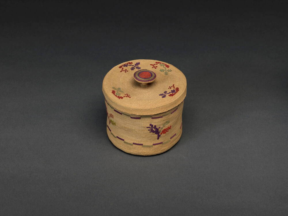 DescriptionSmall finely woven lidded basket with a broken line motif along the upper and bottom border. Delicate floral motifs encircle the lid and the body of the basket.ProvenanceBruce Hartman, Prairie Village, KS;