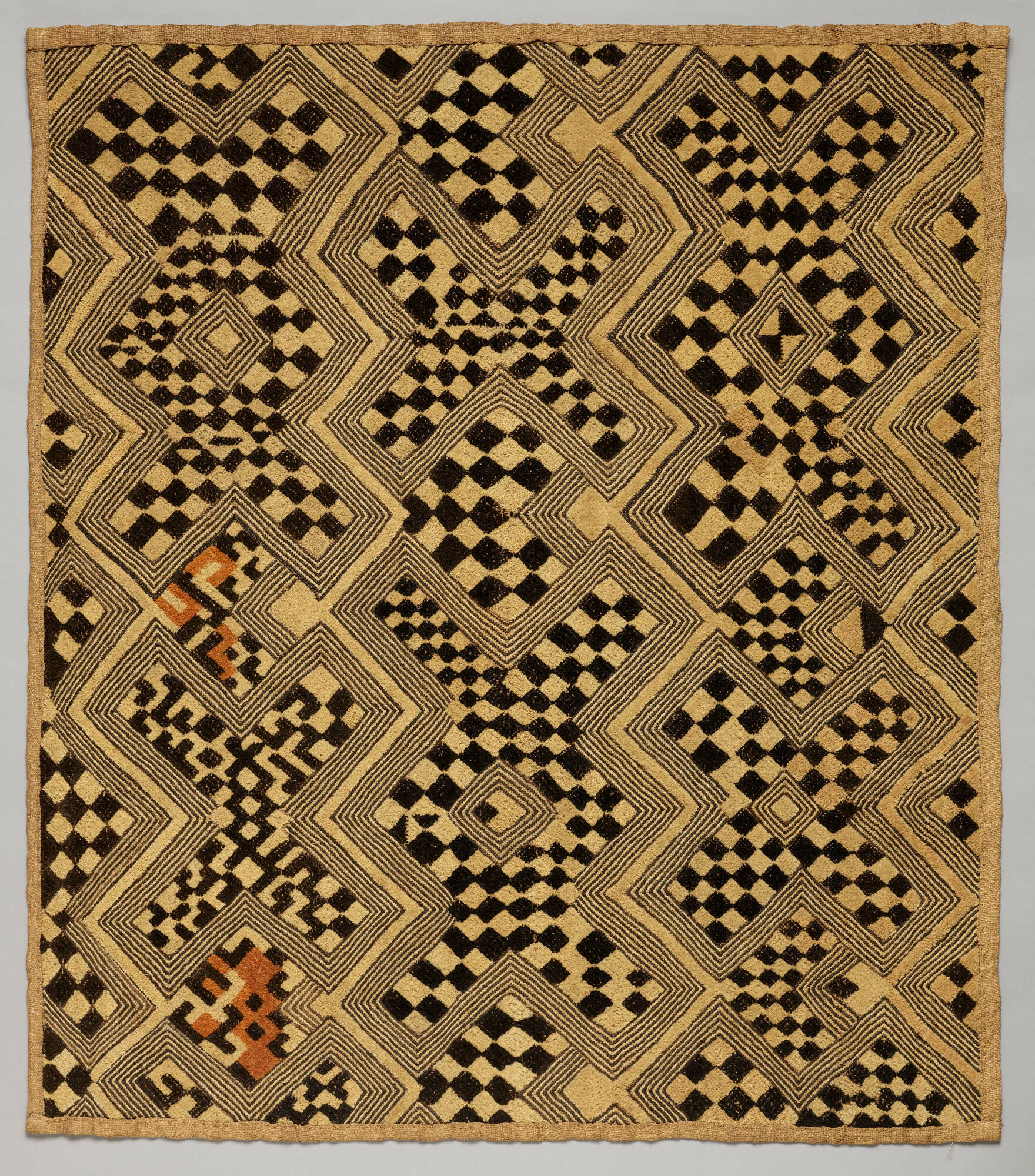 Description"X" patterns cover this panel. These patterns are formed by off-white and black checkerboard pile and outlined in embroidered black and off-white lines. Tan and rust elements enliven the design.Provenance