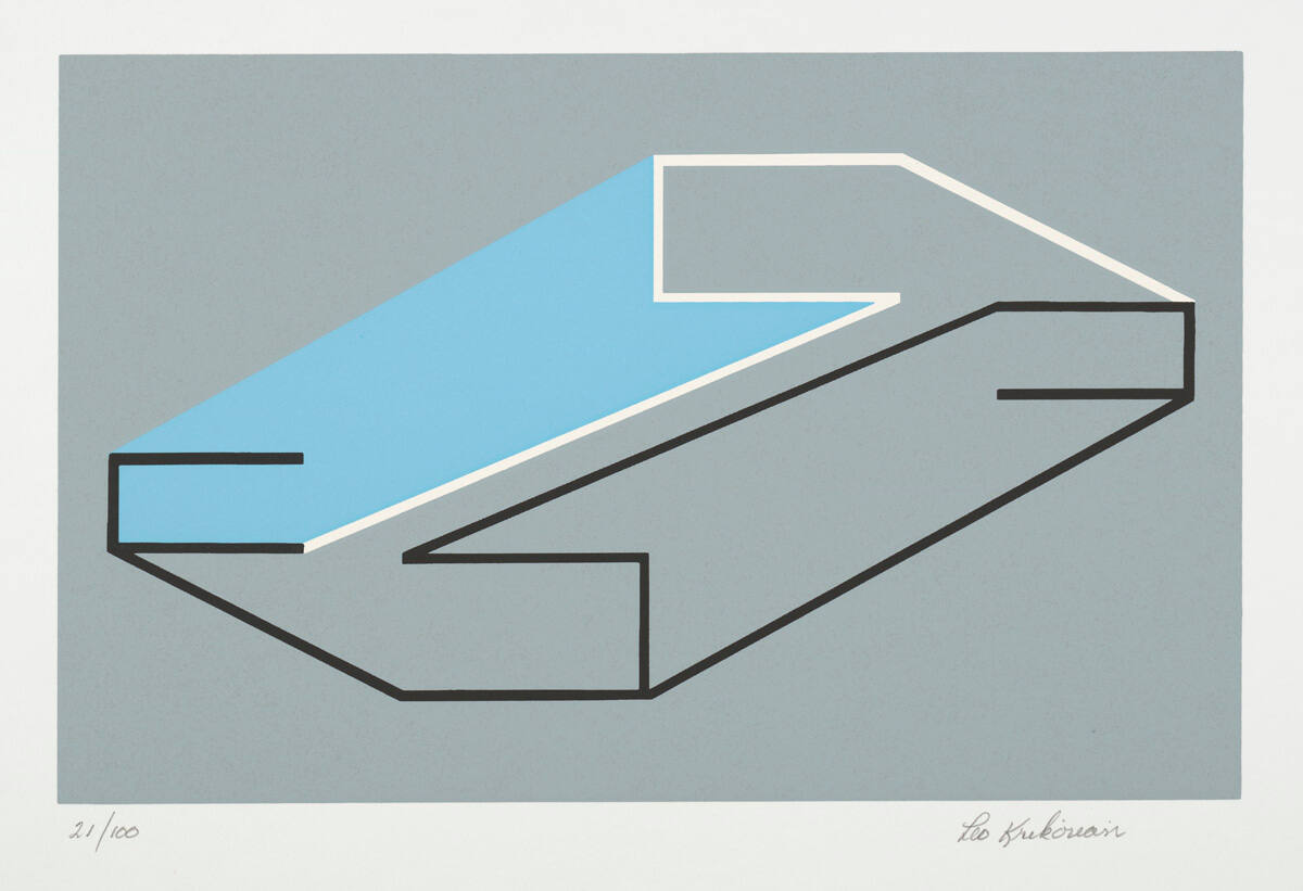 DescriptionA geometric configuration rendered in light blue is joined to a linear motif depicted only as an outline. Both motifs float on a gray ground. A white line connects the two forms.Copyright© Leo Krikorian Estate