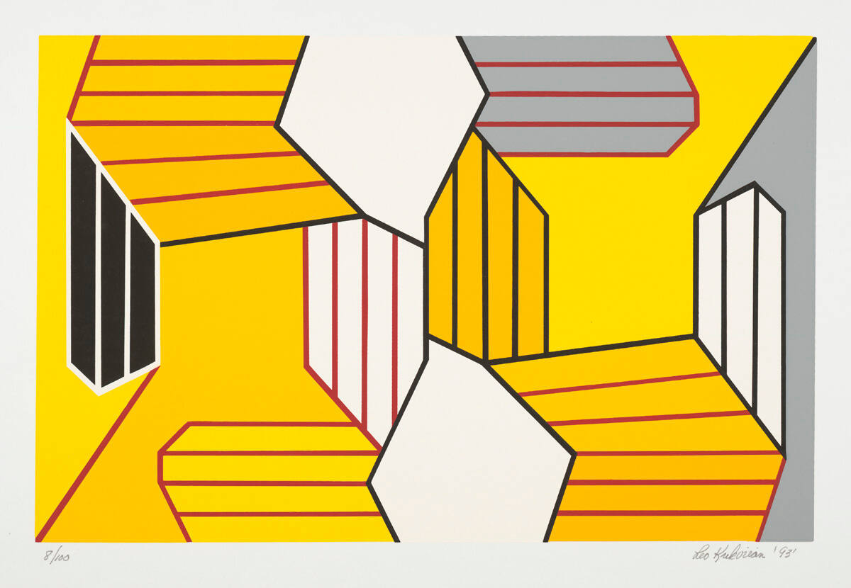 DescriptionThe print is divided into geometric forms that are dispersed over the surface. The dominate color is yellow with a small section of black at the left, 3 segments of white at the center and one to the right, with two areas of grey at the top and right. Paralle lines are indicated over some of the colored segments.Copyright© Leo Krikorian Estate