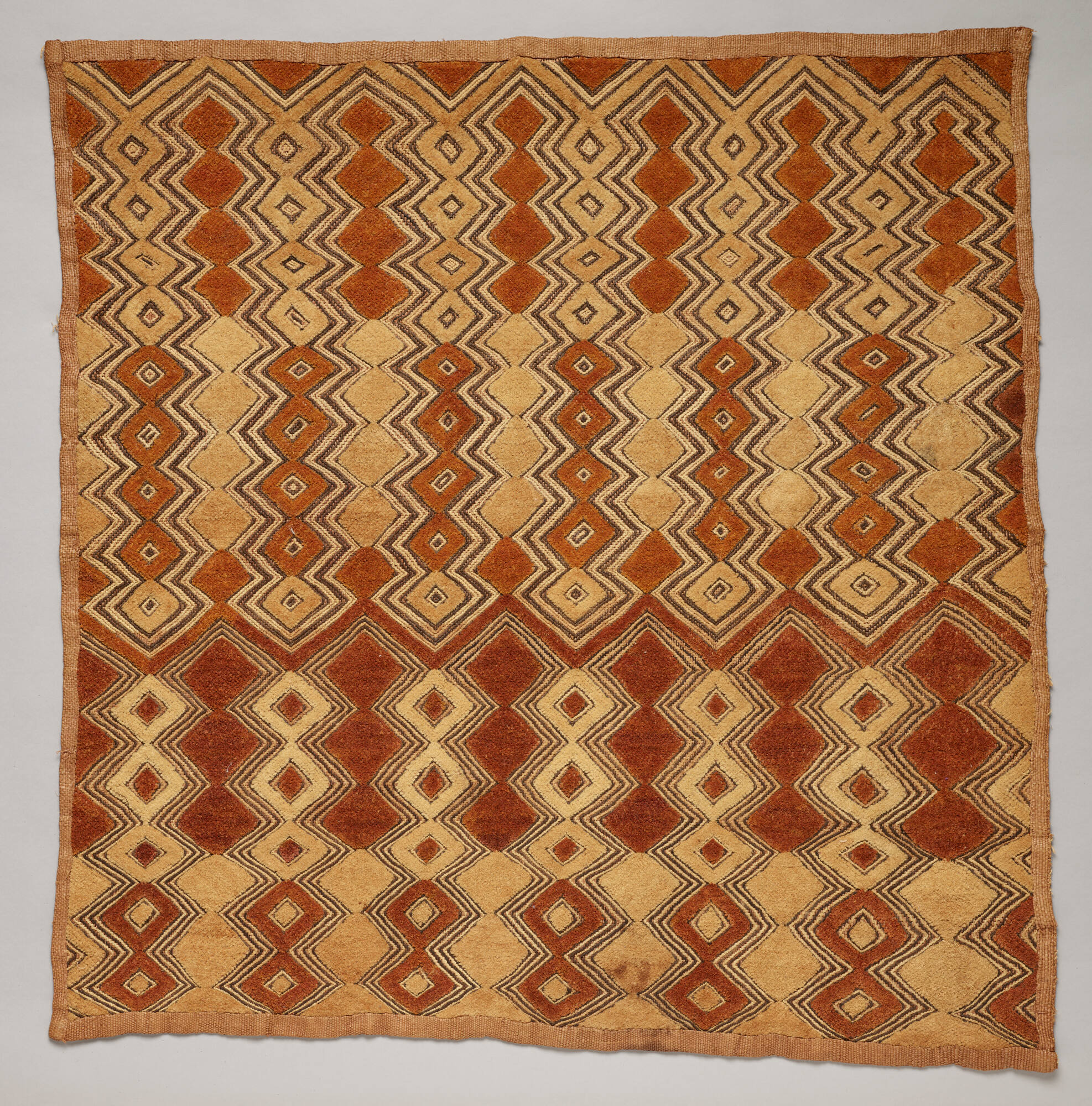 DescriptionOpen and closed diamond designs in rust and natural pile alternate with dark brown and off-white embroidery.ProvenanceFifi White, Kansas City, MO, by 1986-2003;