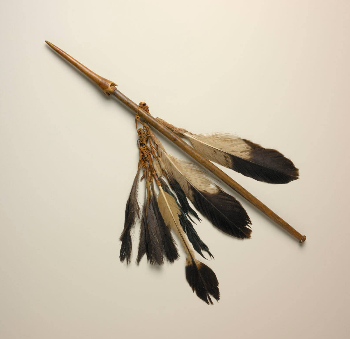 DescriptionA long, cylindrical black-stained staff with defined head; red-stained and pointed at the end with four distinct projections at the base. A cluster of feathers hangs from the shaft.