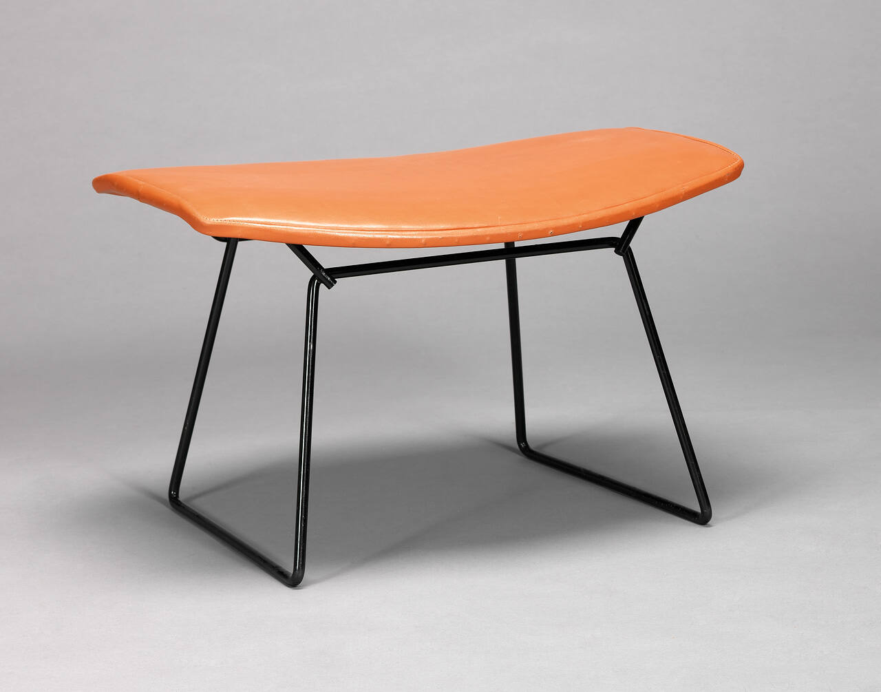 DescriptionThe top of the stool is a grid of 12 horizontal and 19 vertical 1/8" diameter steel ribs which are coated in black plastic. The cushion is made from orange Naugahyde. The top of the cushion covers the stool and wraps under the grid about two inches.Copyright© Estate of Harry Bertoia / Artists Rights Society (ARS), New York