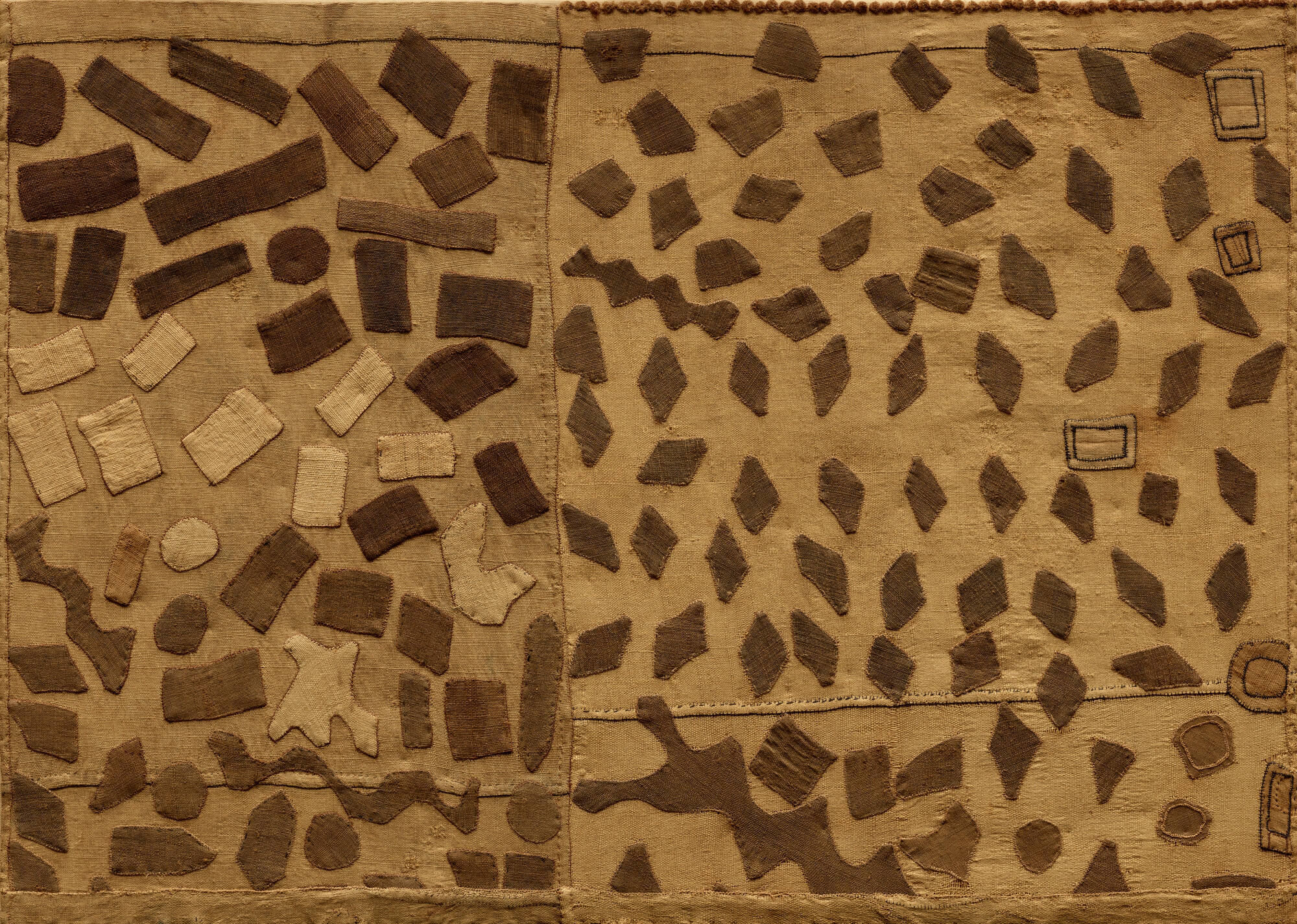 DescriptionThis textile is made of fragments of a woman's appliqué skirt. The fragment on the left has a brown background with organic off-white and dark brown appliquéd shapes. The fragment on the right has an off-white background with dark brown appliquéd shapes and five off-white shapes on the right that are overstitched with black; pom-pom finge edges the top.ProvenanceFifi White, Kansas City, MO, by 2003;