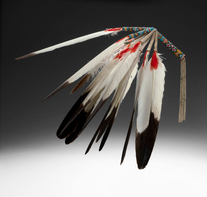 DescriptionFeather fan comprised of thirteen large black-tipped eagle feathers, two with beaded bases, loosely attached to predominantly blue-beaded handle with white-painted twisted leather fringe at base. Cluster of eagle feathers, two with beaded bases, attached to beaded handle with white-painted twisted fringe at base.Published ReferencesTorrence, Gaylord, ed. Continuum: North American Native Art at the Nelson-Atkins Museum of Art. Kansas City: Nelson-Atkins Museum of Art.
