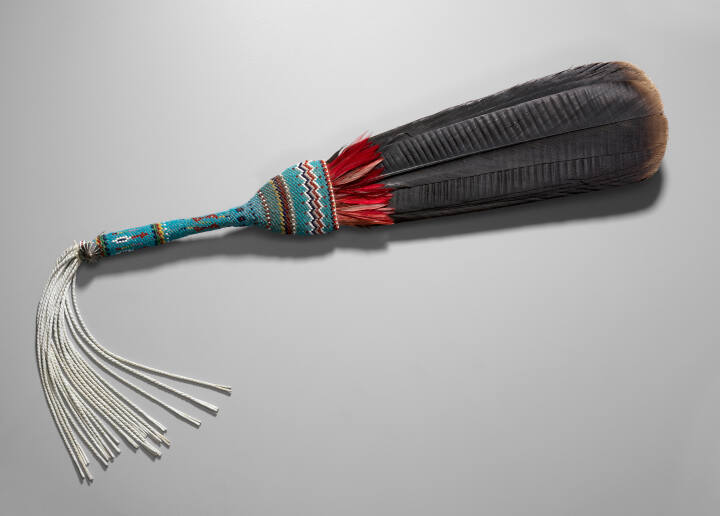 DescriptionFeather fan comprised of dark-colored bird's tail, set into predominantly blue-beaded handle, with white-painted twisted leather fringe at base; a single Navajo silver button is attached at the base of the handle. Feather fan comprised of bird's tail set into beaded handle with twisted leather fringe at base.