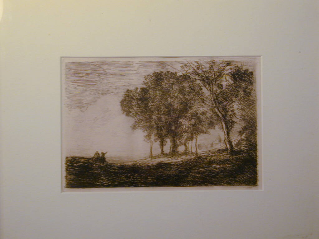 DescriptionOn dark, sloping ground, two small figures, one with arm outstretched, short distance from group of tall trees, right, with view of building and domed church in middle rear. Pale clouds beneath lines of sky above, across top.