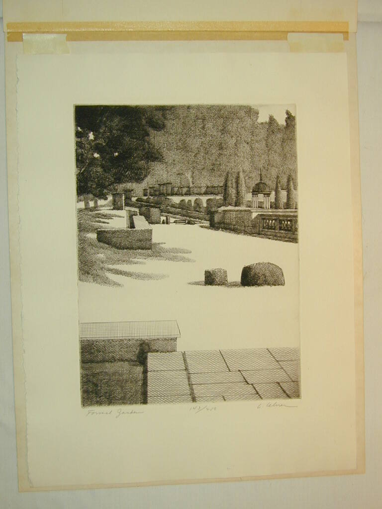 DescriptionBeyond plane of blocks and low wall, foreground, empty white space with two small upright forms; wall, left, with tree shadows. Right, balustrade and hedge frame garden with domed gazebo having two cypresses on each side; wall and tall solid barrier of trees across top.Copyright© Estate of Leonard Lehrer